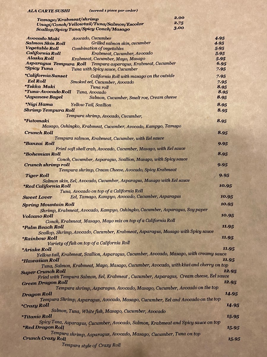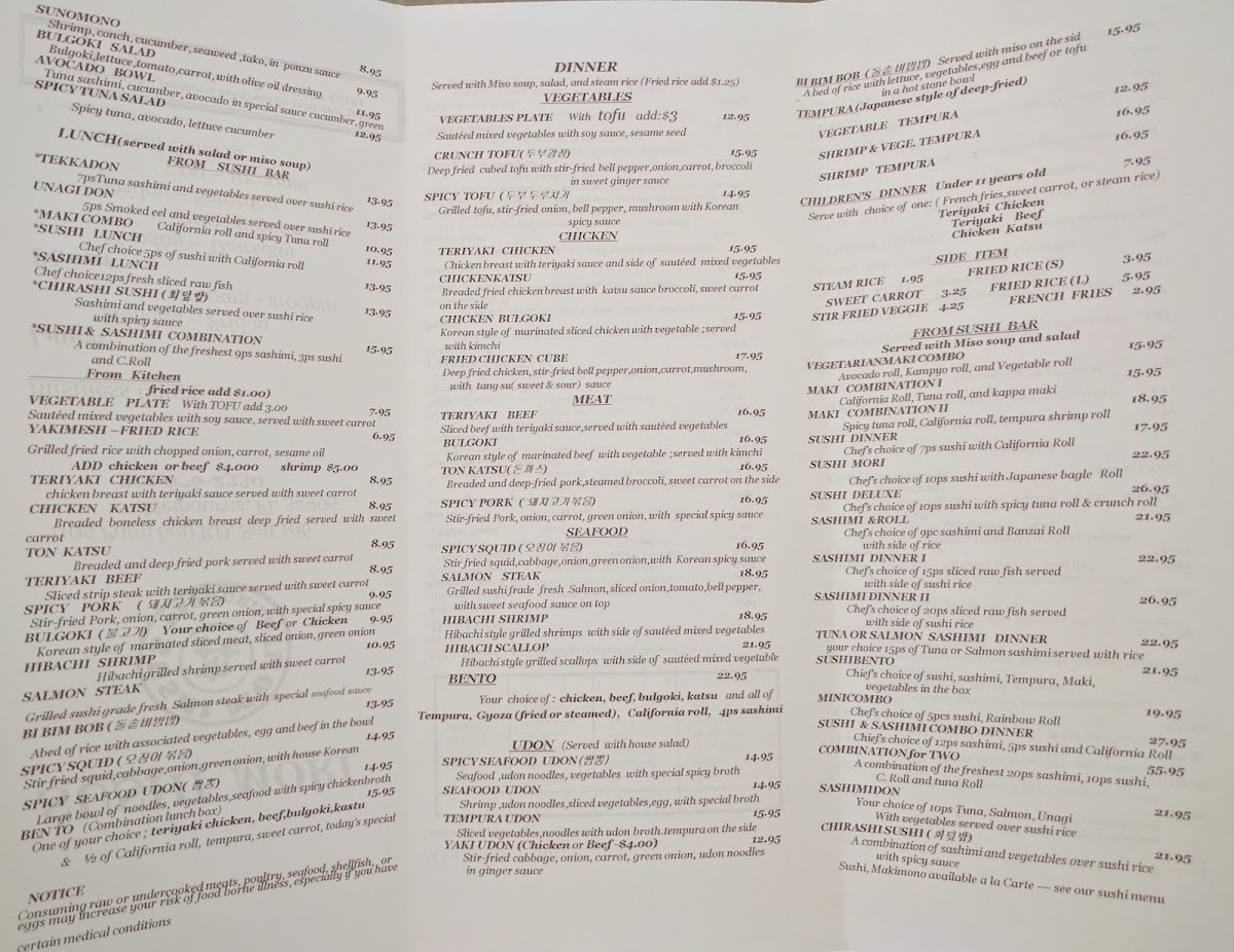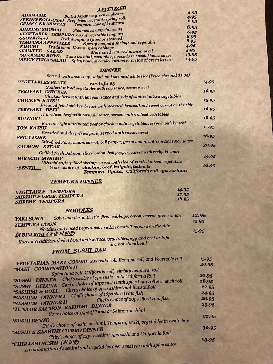 Expect to enjoy a variety of flavors throughout the day, from light appetizers like edamame and gyoza to hearty entrees such as teriyaki chicken and pork tonkatsu. Signature sushi rolls, including the Tiger Roll and Green Dragon Roll, are excellent choices for those seeking familiar yet refined bites. Alongside these, dishes like bibimbap and spicy tuna rolls add a subtle fusion touch, enhancing the overall menu without overwhelming the traditional Japanese atmosphere.